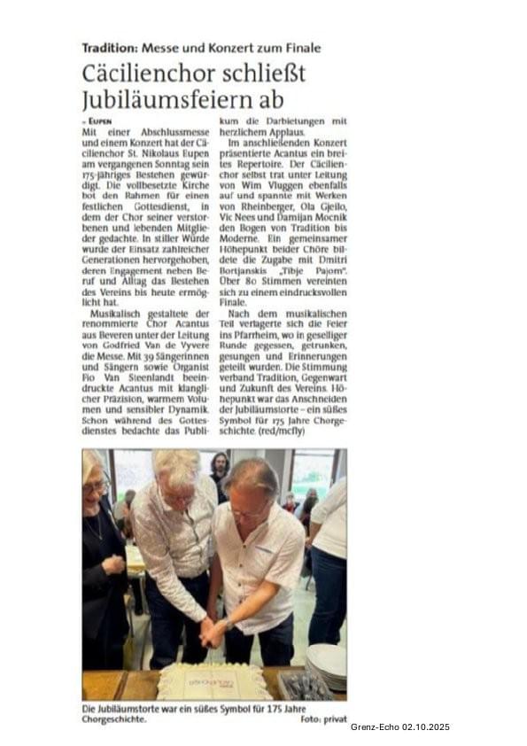 wurde.Nächster Höhepunkt imJubiläumsjahr ist der Auftritt des Universitätschors Maastricht beim Eupen